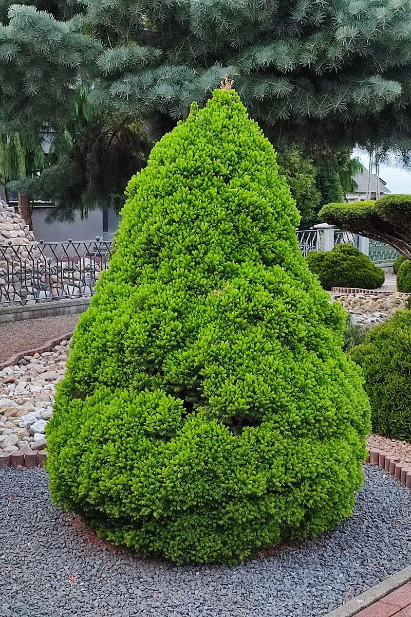 W ogrodach świerk Conica występuje w zróżnicowanych zestawieniach – od minimalistycznych aranżacji po klasyczne, w których jego symetria idealnie współgra z geometrycznymi formami. Świetnie komponuje się z roślinami niskopiennymi, takimi jak lawenda czy wrzosy, co tworzy efektowne połączenie barw i kształtów. Co więcej, jego kształt doskonale kontrastuje z innymi elementami ogrodowej architektury, jak drewniane lub kamienne ścieżki, co sprawia, że całość tworzy harmonijną przestrzeń. W ten sposób nie pozostaje żadnych wątpliwości, że Conica może stać się punktem odniesienia w innowacyjnych i nowoczesnych projektach ogrodowych.
